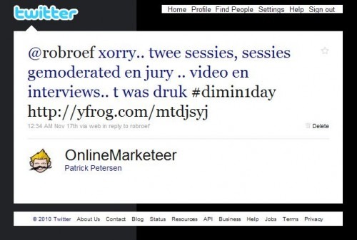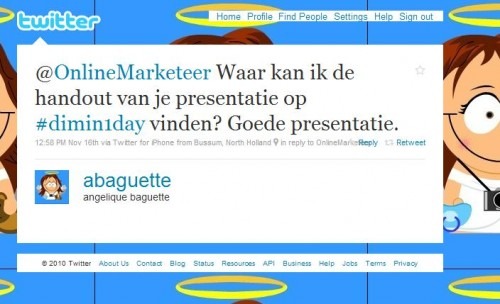 Dinsdag 16 november 2010 mocht ik spreken op de DIM in 1 Day in Bussum. Twee sessies: een verhaal over Social Media Strategie(abstracter) en een concrete track over Social Mobile Marketing do’s en dont’s .